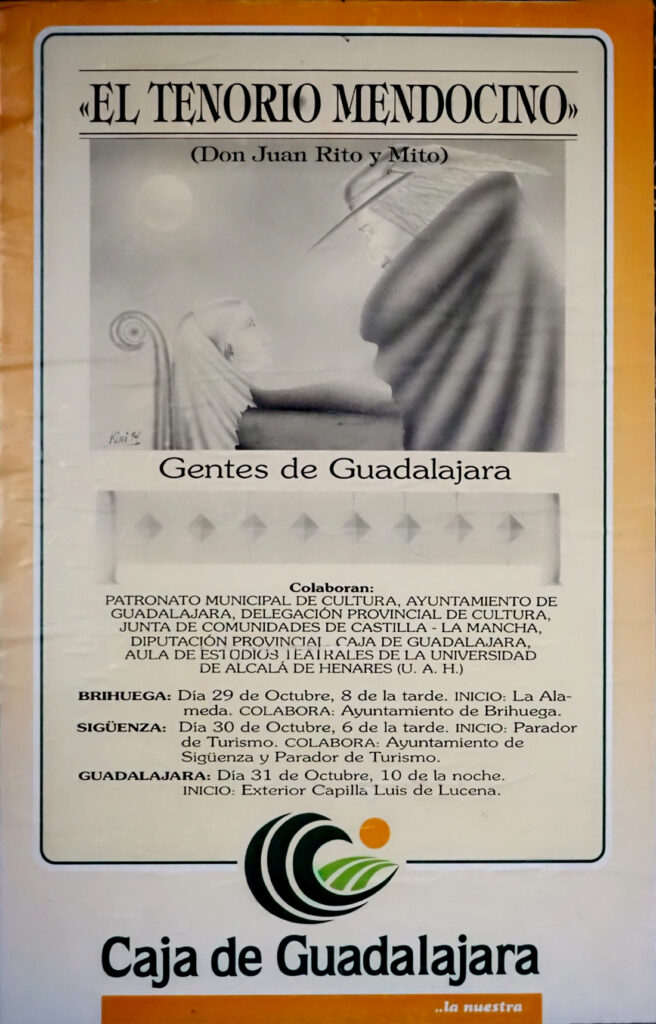 Hace ya unas décadas, cuando los «Amigos de la Capa de Guadalajara» en sus cenas anuales, que celebraban en la noche de ánimas, y para animar la sobremesa comenzaron a representar algunos fragmentos de la obra teatral «Don Juan Tenorio«, de José Zorrilla; nacía lo que en muy poco tiempo pasó a ser el «Tenorio Mendocino«, don Juan «Rito y Mito»; representaciones itinerantes de esta inmortal obra aprovechando los espacios mendocinos en la ciudad de Guadalajara.