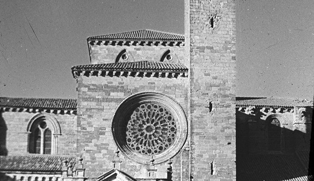 Desde la carretera que lleva a Atienza, par para fotografiar una vista panorámica de la ciudad. Luego entró en la Ciudad del Doncel, recorrió sus calles y entre las muchas fotos que hizo, fotografío la fachada meridional de catedral de seguntina con la torre del Gallo desde los soportales del ayuntamiento.