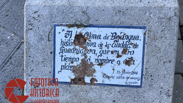 A sus pies hay un placa de cerámica, ya muy deteriorada que reza «A la Olma de Bejanque, historia viva de la ciudad de Guadalajara, que en otro tiempo dio nombre a esta plaza. 13 de junio de 2008 (Vísperas del solsticio de verano)«.