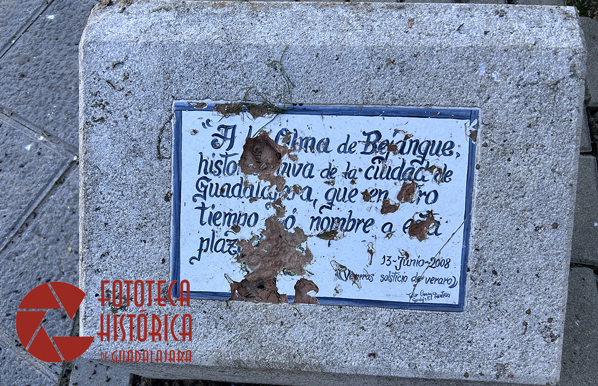 A sus pies hay un placa de cerámica, ya muy deteriorada que reza «A la Olma de Bejanque, historia viva de la ciudad de Guadalajara, que en otro tiempo dio nombre a esta plaza. 13 de junio de 2008 (Vísperas del solsticio de verano)«.