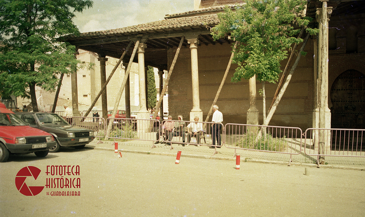 La imagen nos ofrece un rincón de la plaza de Santa María, por la que aún circulaban coches con destino o salida del barrio del Alamín por el puente de las Infantas. El edificio religioso había sufrido con el tiempo graves deterioros, ya que por aquellos años tuvieron que apuntalar el tejado de su atrio por peligro de derrumbe. Poco tiempo después sufrió una importante reforma.